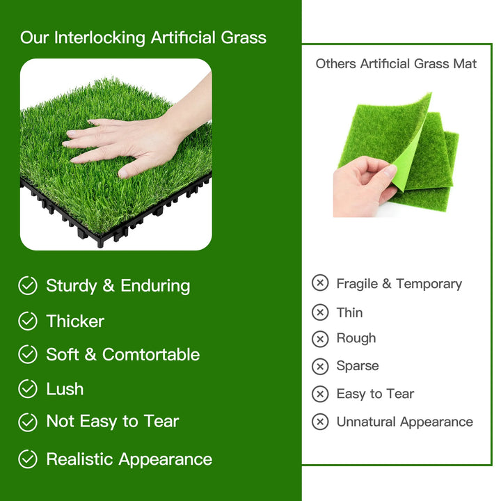 - 【Versatile Outdoor Tiles】Upgraded artificial grass are perfect for various outdoor spaces, including patios, balconies, yards, gardens, backyards, decks, paths, porches, poolside areas, and playgrounds. They can even be used as a grass pee mat for dog or pet training.