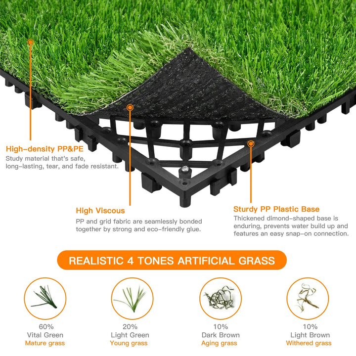 - 【Ultra-Realistic Looks】The interlocking artificial grass tiles are made from realistic four-tone PE turf, offering a natural, lifelike appearance. Tufting technology ensures that walking barefoot on the square tiles feels just like walking on real grass. Our artificial turf is made with high performance yarn construction to look and feel just like real grass, even under frequent heavy use.
