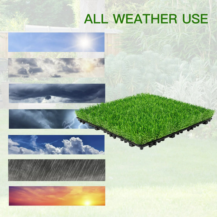 - 【Easy DIY & Minimal Maintenance】These artificial grass tiles feature an interlocking design for easy installation. Simply connect them, you will create a vibrant indoor or outdoor space. The built-in drainage holes enable rainwater to pass through effortlessly, preventing water accumulation and enhancing durability. Minimal maintenance required—simply rinse the turf with a hose or sweep with a broom to remove dirt. You can also brush the fibers to keep the artificial grass fluffy and natural-looking.