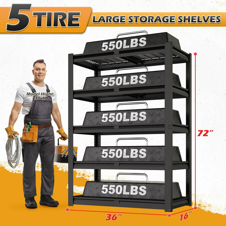- 【Large Storage Space】This garage storage shelves has a large 5-layer structure of 36"W x 16"D x 72"H, providing you with ample storage space for various heavy items, such as: garage tires, basement paint buckets, 40 gallon fish tanks, cloest storage container of various sizes, living room aquariums, etc. Compared with MDF board storage shelves, this wire rack shelving are breathable and not easy to get wet. So this shelving unit is very suitable for humid scenes such as garages, warehouses, basements, pantry room, closets, kitchens, laundry room, etc. The smooth black shelving rack can match every home style.