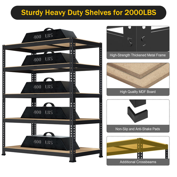 【Heavy Duty Metal Storage Shelves】Trumanpick storage shelves are made of thickened Q195-grade metal steel columns and FSC-Certified high-quality thick MDF boards. Adding an extra middle support beam to each shelf significantly enhances the stability and load-bearing capacity of the storage shelf unit. The heavy-duty shelving supports up to 400 lbs per tier, with a total load capacity of 2000 lbs for the 5-tier storage rack.