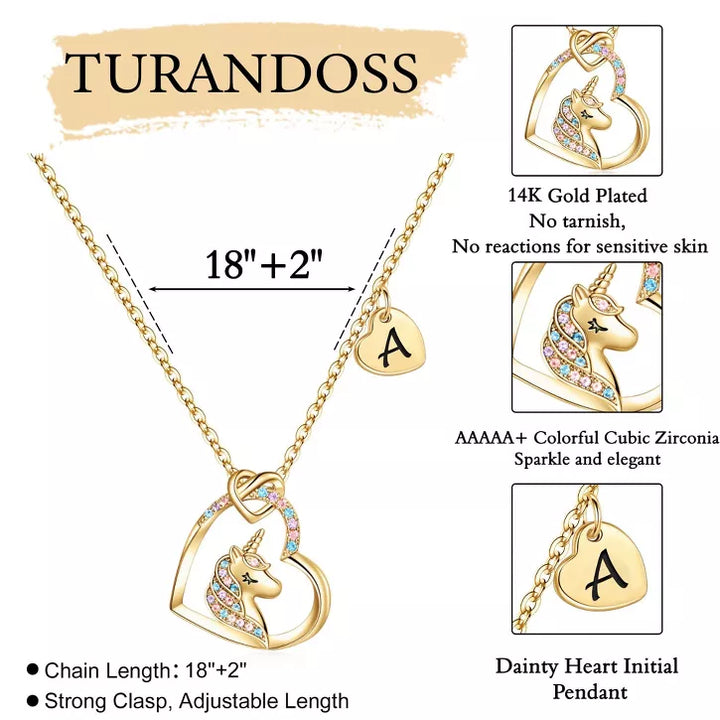 Gold Unicorn Necklace Gifts for Girls Daughter - A Dreamy Gift for Girls, a Sparkling Choice for Childhood! This adorable gold unicorn necklace gifts for girls daughter is made of hypoallergenic copper and plated with 14K gold, with an adjustable chain length of 18'‘+2’' to suit different ages, and a diamond heart-shaped unicorn pendant and heart-shaped pendant, the double-layered design combines sophistication and fairytale feel, making it an easy gift for birthday parties and holiday surprises. This heart pendant initial unicorn necklaces for girl teens is made of hypoallergenic copper with anti-allergy treatment, which is safe for sensitive babies. The unicorn pendant is hand-set with imitation diamonds and has a rounded heart shape. The letter pendant is precision engraved with a smooth and delicate surface, and the plating layer has passed the 48-hour salt spray test, so it will remain as bright as new even after long-term wear. The chain is designed with a lobster clasp, which is easy to adjust and stable to wear, emphasizing safety and quality control in details. The main pendant is centered on a three-dimensional diamond-set unicorn, with a small heart-shaped pendant that can be customized with a, forming the visual theme of “guardianship and growth”. The warm and soft gold color is suitable for girls dresses, T-shirts, school uniforms and other kinds of children's clothing, which can be used as a cute embellishment for daily wear, or become the focus of a party, conveying the childhood symbolism of “innocence, bravery and dreams”.