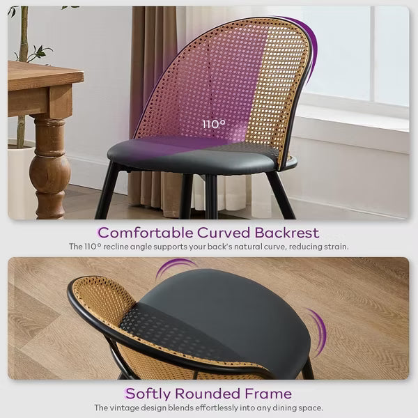 Enjoy superior comfort and style with these mid-century modern dining chairs, featuring an ergonomic 110° curved backrest, breathable hand-woven rattan design, and premium multi-layer seat engineering with stain-resistant faux leather and high-resilience foam. The smart adjustable leg pads ensure perfect height alignment and stability on uneven floors, while the reinforced steel frame with color-coordinated accents supports up to 330 lbs. Easy to assemble in just three steps and backed by lifetime support, these versatile chairs blend farmhouse charm with modern durability for any dining space.