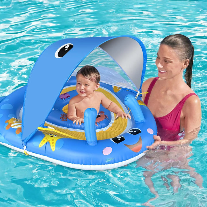 Ucradle Baby Pool Float with Canopy UPF50+ Sun Protection, 6-24 Months Inflatable Infant Swimming Ring with Adjustable Safety Seat