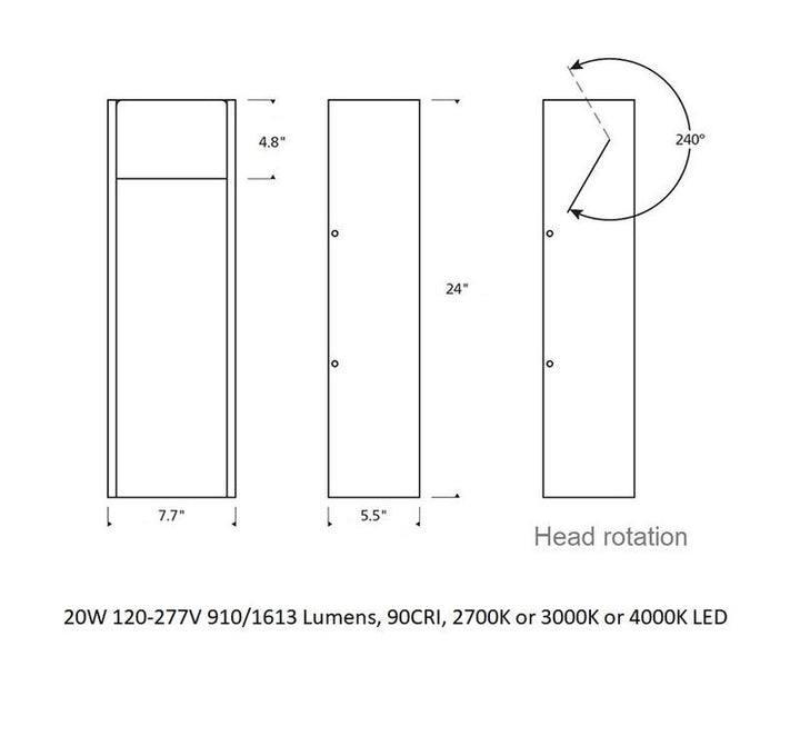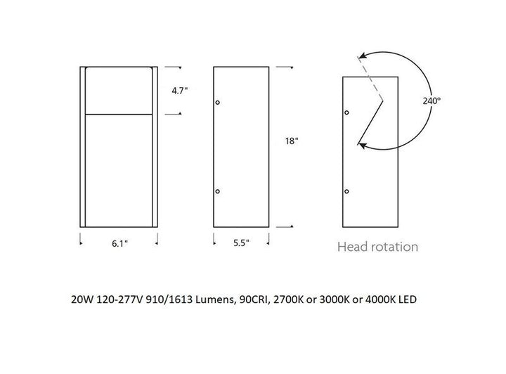 Exhibiting a refined and unadorned minimalist aesthetic, the Zur outdoor wall sconce features an innovative 240° pivot design that aims light precisely for exterior way finding and general illumination. The refined, unadorned minimalism of the Zur wall sconce allows it to become an ideal complement to contemporary architecture. Available in 2 sizes: 18 inch, 24 inch height.